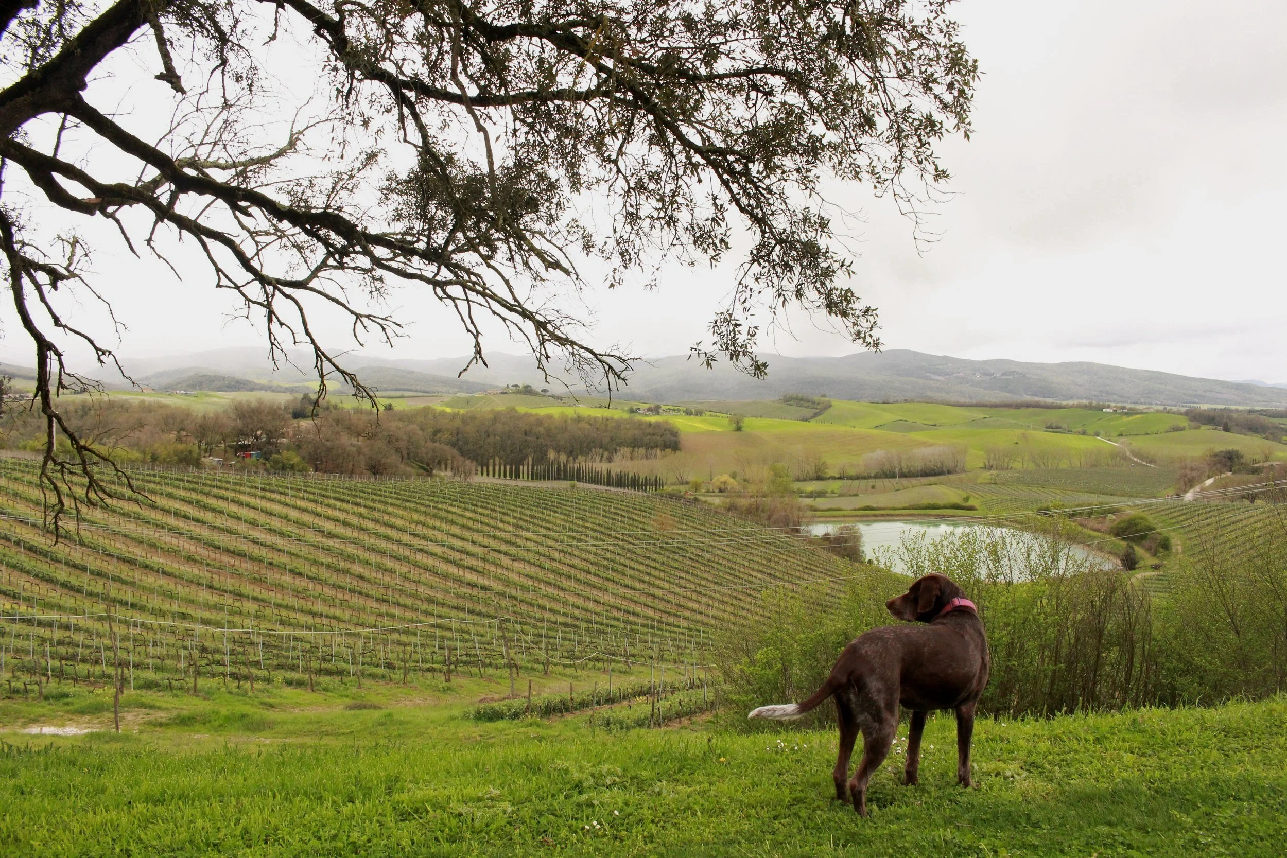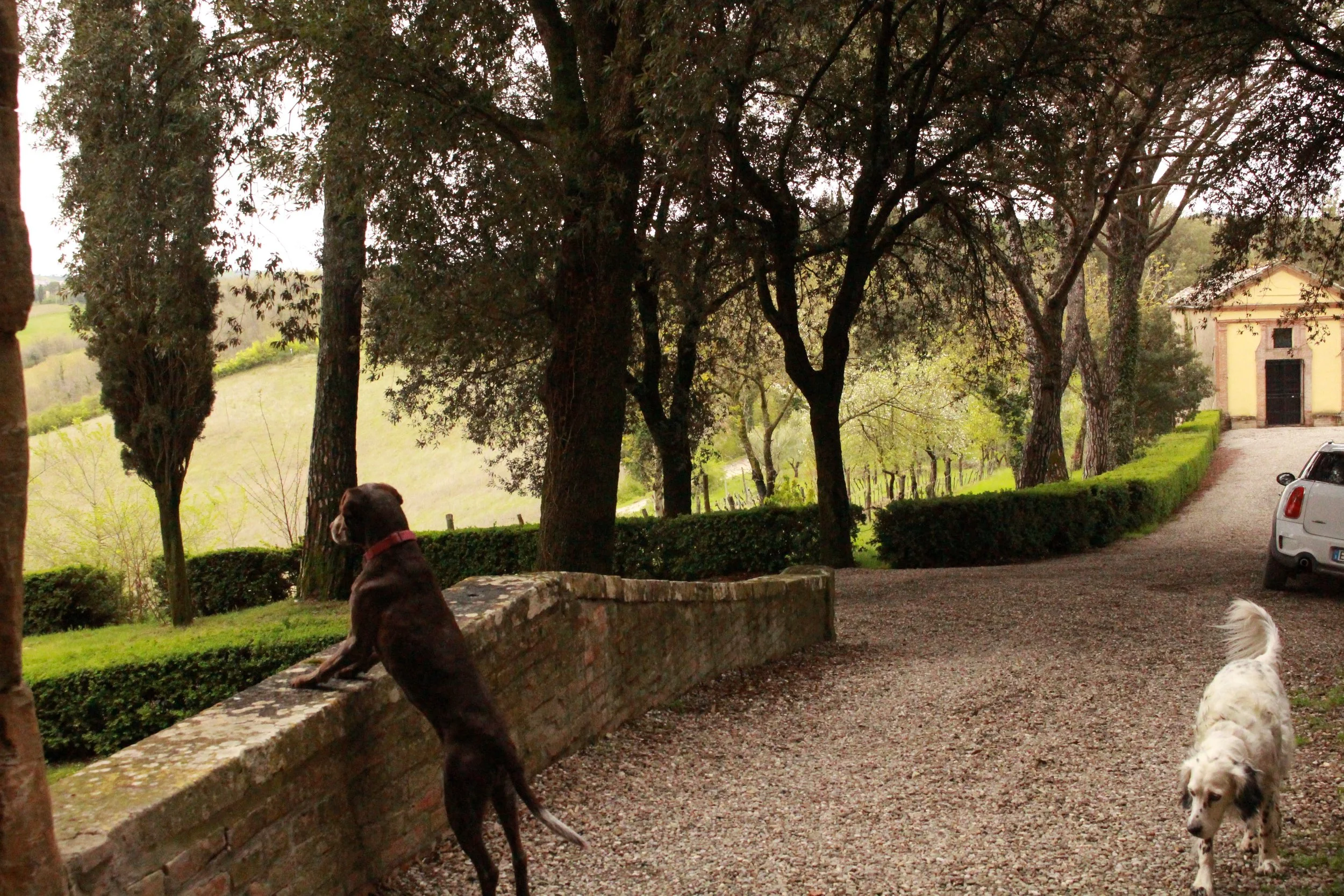 Kristin and I have been in weekly group Italian classes together on Zoom since summer 2020, but this was the first time we met in person, and she and her husband, Peter, were so kind to take my vagabond self under their generous wings for the day on their trip celebrating his retirement. The winery property was stunning; it sits on the Via Francigena and the friendly dogs greet pilgrims and other visitors.