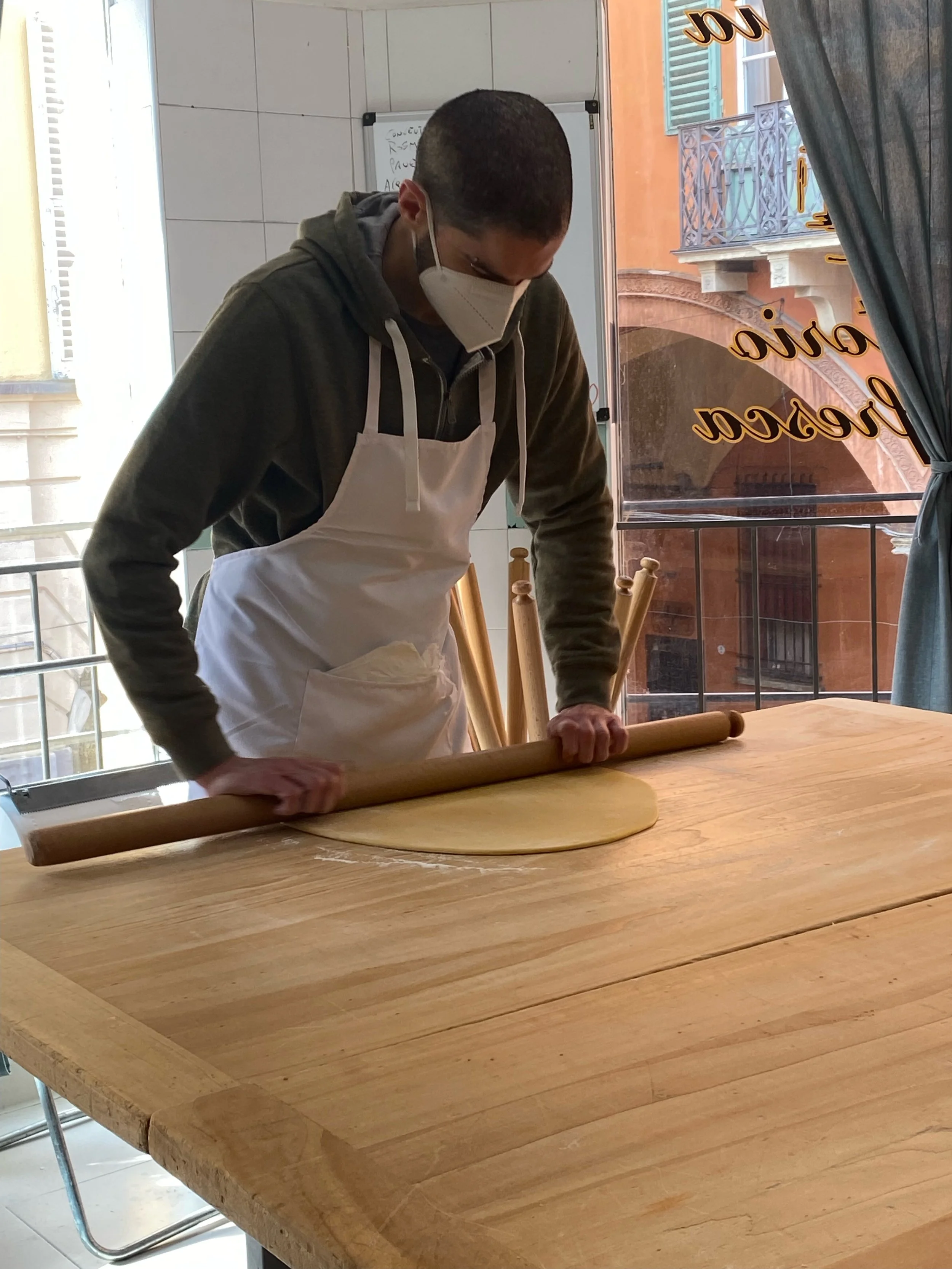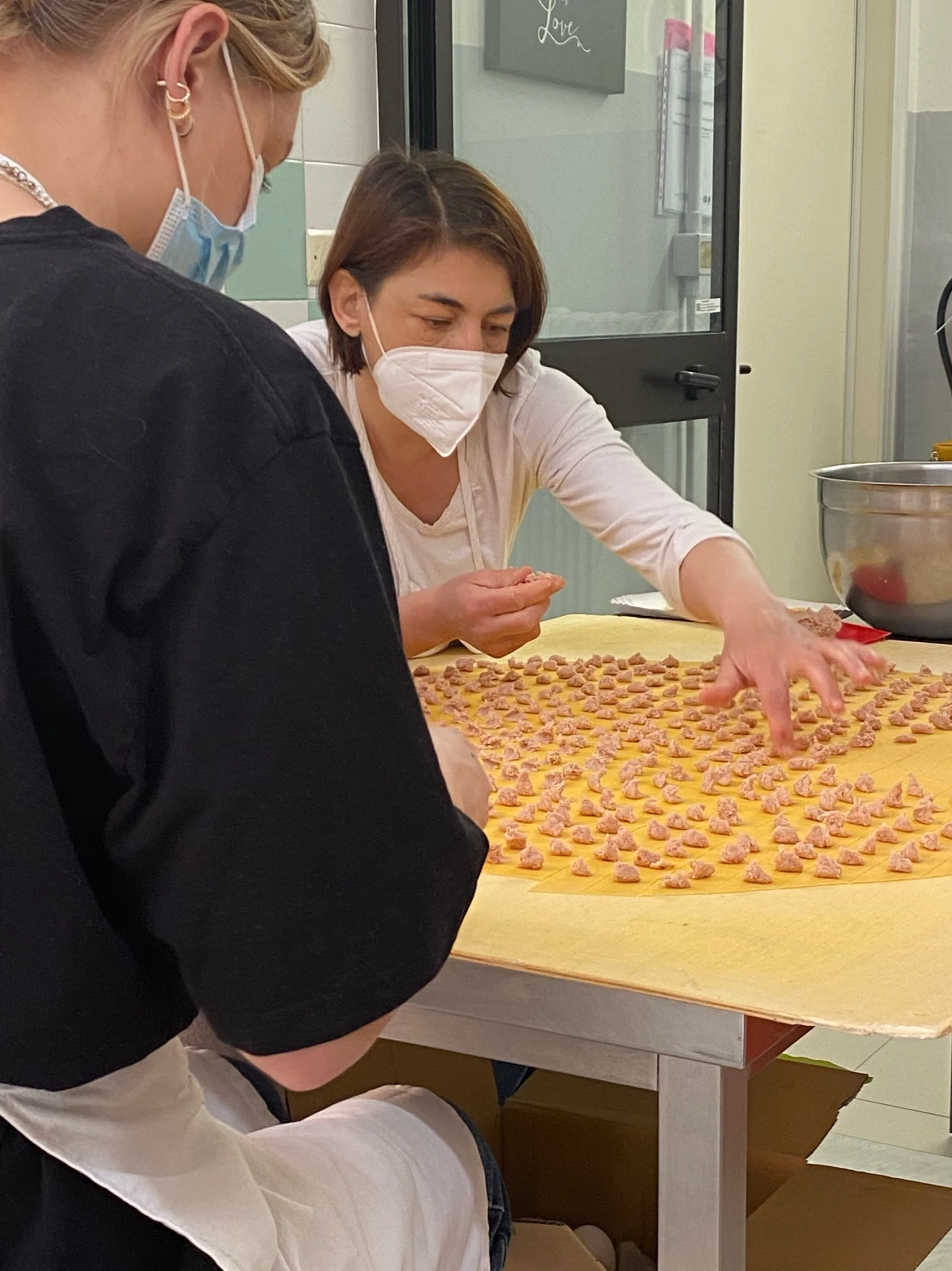 or those who make the ‘sheet’ - foglia - of the egg + flour pasta of Emilia-Romagna. We visited a pasta workshop where they were making the pork-filled pasta for tortellini in brodo. Mattia explained that tortellini can ONLY have a pork filling. Tortelloni, the big ones, can have other fillings.