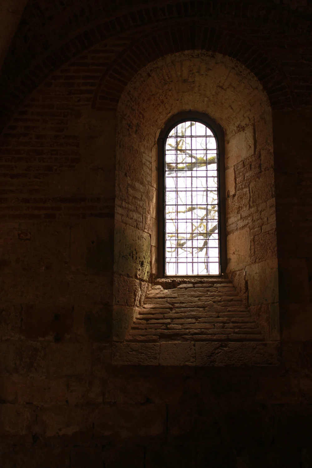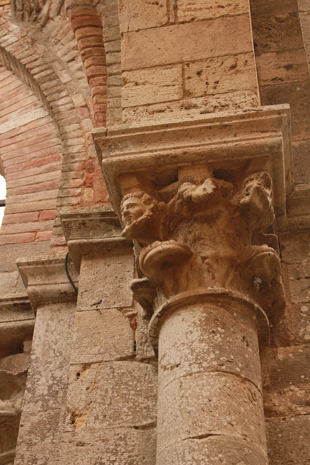 After the backstage tour, we set out for San Galgano. He smoked in the car after asking my permission and buzzed around the hairpin turns. The roofless Abbey was eerie and grand. Ezio used the word maestoso, majestic. He pointed out that the architect put himself in the work: see the little face on the top left of the column capital in the photo below. We also saw the Chapel of Montesiepi, just up the hill from the Abbey, which is where legend says Saint Galgano stuck a sword into a rock and it turned into a cross. It’s a small Romanesque building with the sword-in-the-stone right in the middle. In a side chapel, Ezio and I saw a container on a stand over to the side, with a maroon satin cloth draped over it. Naturally, we lifted up the edge to see what was under and it was a couple leg bones in a glass box. Just stacked up in there like logs. And we both gasped a little, and then of course the slippery cloth fell right off to the floor and the whole box o’ bones was exposed. Ezio quickly recovered it, laughed and said scusi to whoever that was.