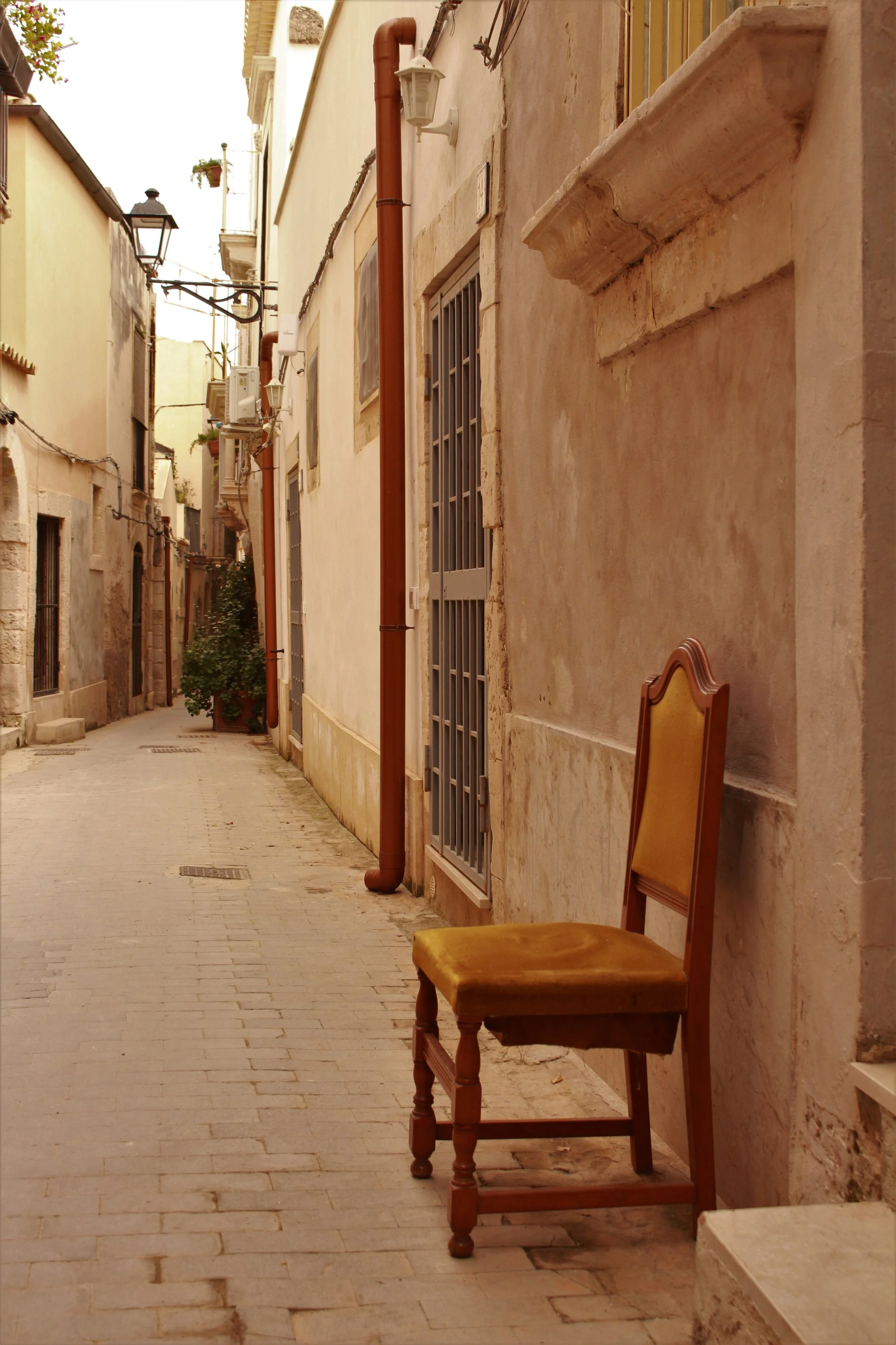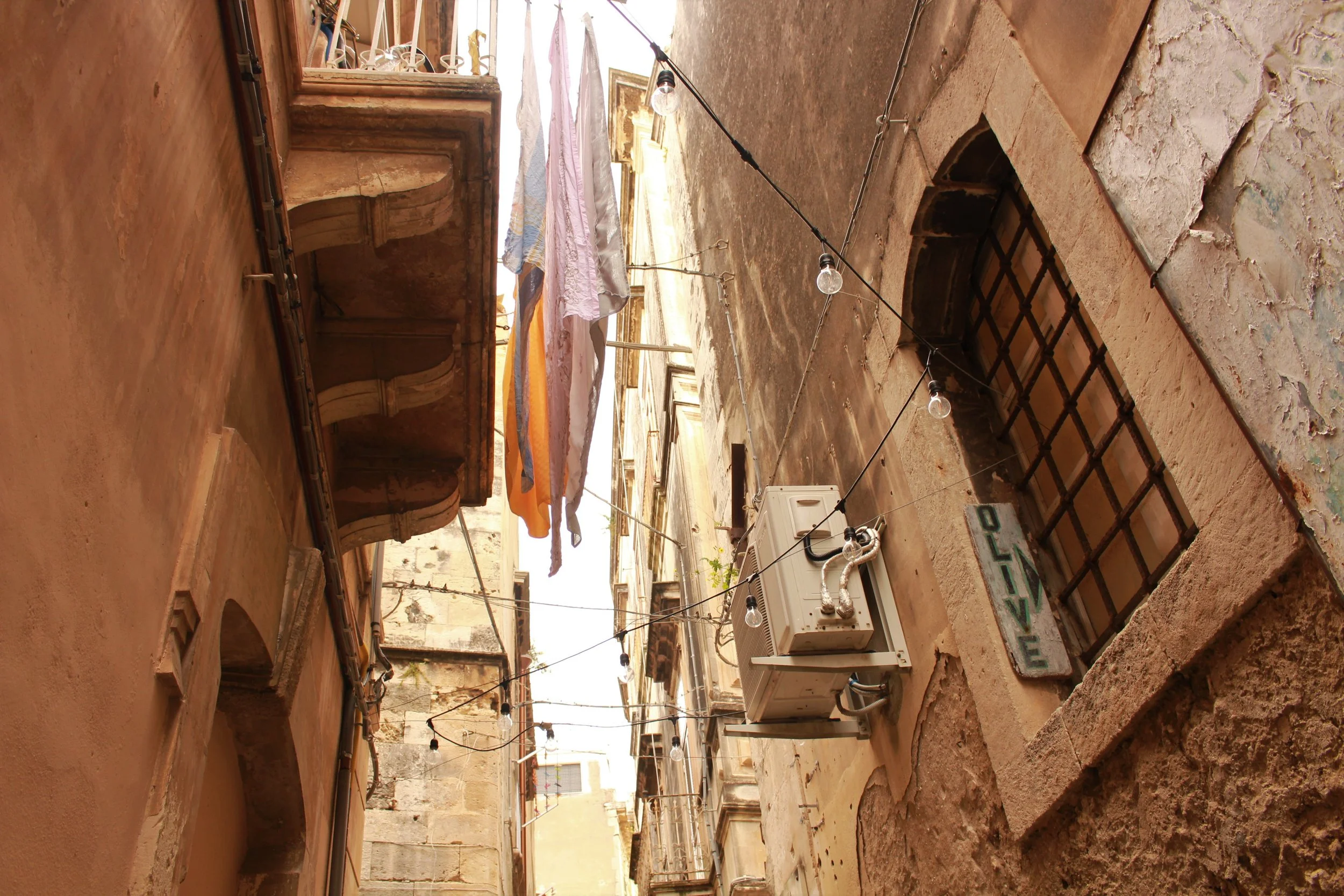 Side street scramble: the laundry, the OLIVE sign, the AC unit against the peeling facade, bellissima